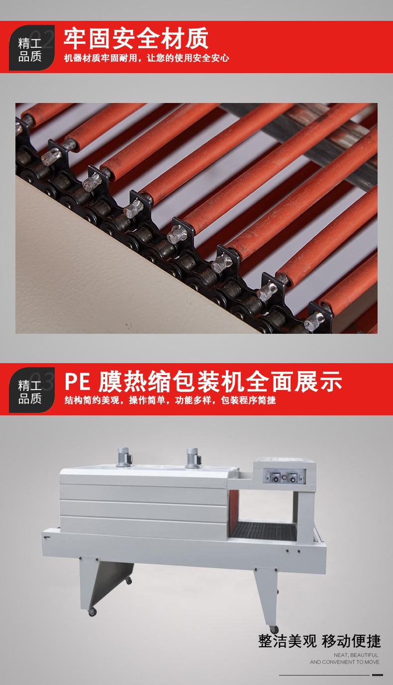 - 廣泛的產品適用性:能夠適應各種形狀、大小和材質的產品包裝。無論是小型的文具、首飾,還是大型的家具、工業設備等,都可以使用 PE 熱收縮包裝機進行包裝。對于不同尺寸的產品,只需調整輸送帶的速度和加熱時間等參數即可。同時,它也可以與多種包裝材料兼容,只要是 PE 薄膜,無論其厚度、韌性等特性如何,都能通過適當的參數調整實現良好的包裝效果。
