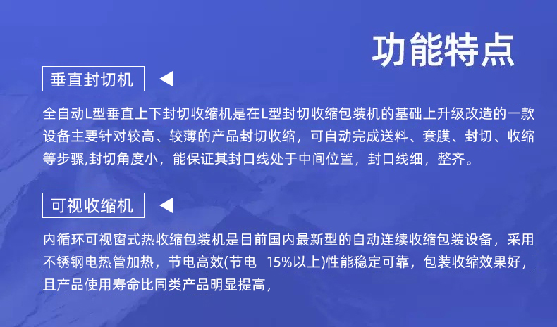 全自動(dòng)垂直封切熱收縮包裝機(jī)憑借高效自動(dòng)化、封口平整、適用范圍廣的特點(diǎn),適配多行業(yè)的產(chǎn)品包裝需求,尤其適合需要批量包裝、追求外觀整潔或需防潮防塵防護(hù)的物品。垂直封切上下驅(qū)動(dòng),封口均勻無折皺,適合高度方向尺寸大的產(chǎn)品;L 型封切效率更高,適合扁平小件批量包裝。