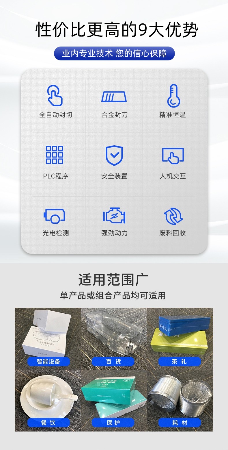 適合規(guī)則 / 不規(guī)則盒裝、瓶裝、禮盒裝產(chǎn)品(如食品禮盒、醫(yī)藥盒、日化套裝),尤其適配批量≥300 件 / 小時(shí)的生產(chǎn)線,相比 L 型封切機(jī)更適合易折皺、需精準(zhǔn)封口的產(chǎn)品。