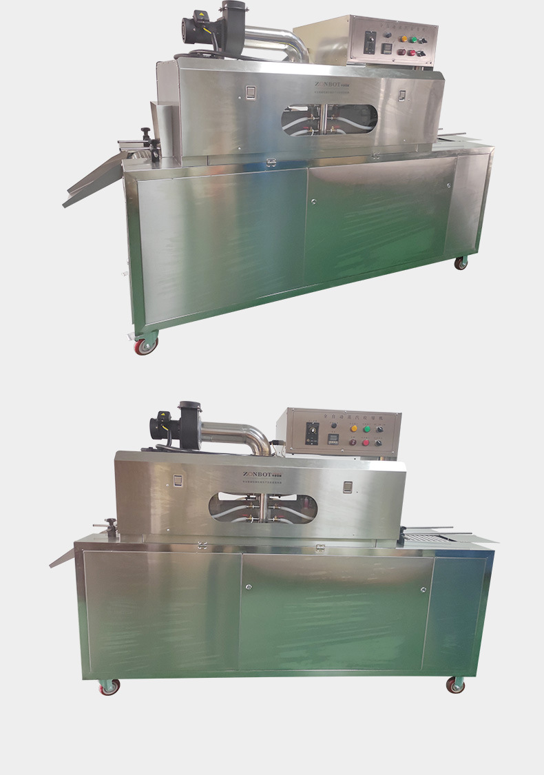 收縮階段:包裝好的產品接著被輸送到蒸汽收縮部分的收縮通道入口。此時,蒸汽發生系統已經產生了合適的蒸汽,蒸汽通過噴頭均勻地噴灑在產品的包裝薄膜上。包裝薄膜在蒸汽的熱量作用下開始收縮,緊密貼合在產品表面。產品在輸送系統的推動下繼續在收縮通道內移動,保證薄膜各個部分都能充分收縮。收縮完成后,通風口排出蒸汽,產品在外界環境下冷卻定型,最終完成蒸汽收縮包裝,從出口輸送帶送出一體機。