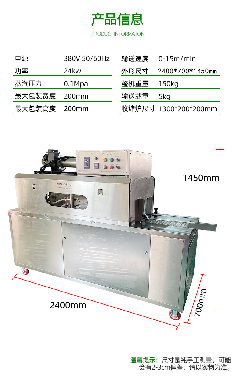 高效一體化:將包裝和蒸汽收縮功能集成在一臺機器上,實現了連續的自動化操作。減少了產品在不同設備之間的轉移時間和人工干預,大大提高了包裝效率,尤其適用于大規模生產和包裝流水作業。