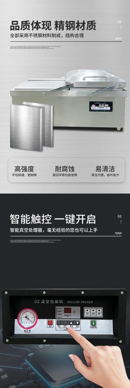 - 真空室:通常由不銹鋼制成,具有兩個(gè)對(duì)稱的工作室,可同時(shí)進(jìn)行真空包裝操作,提高工作效率。工作室底部為平板狀,便于放置包裝物品,且易于清潔。
